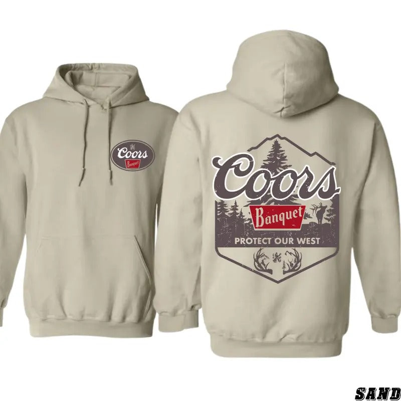 Coors Hoodie - Banquet Protect Our West with Deer Antlers and Forest Graphic, Perfect for Outdoor Enthusiasts and Coors Fans, Hoodie for Men and Women