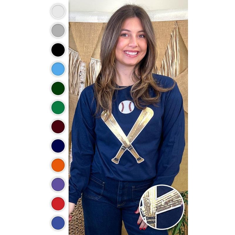 Crossed Bats Sequin Baseball Graphic Long Sleeve T-Shirt