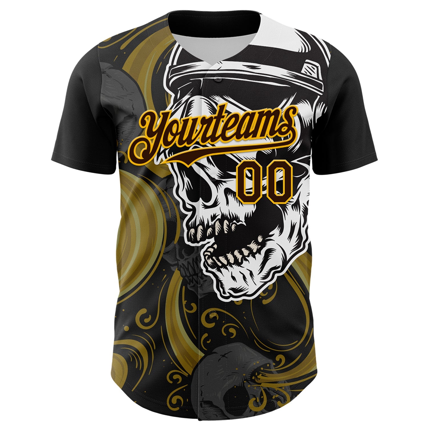Custom Black Brown Yellow-White 3D Pattern Design Burner Costumes Skull Authentic Baseball Jersey