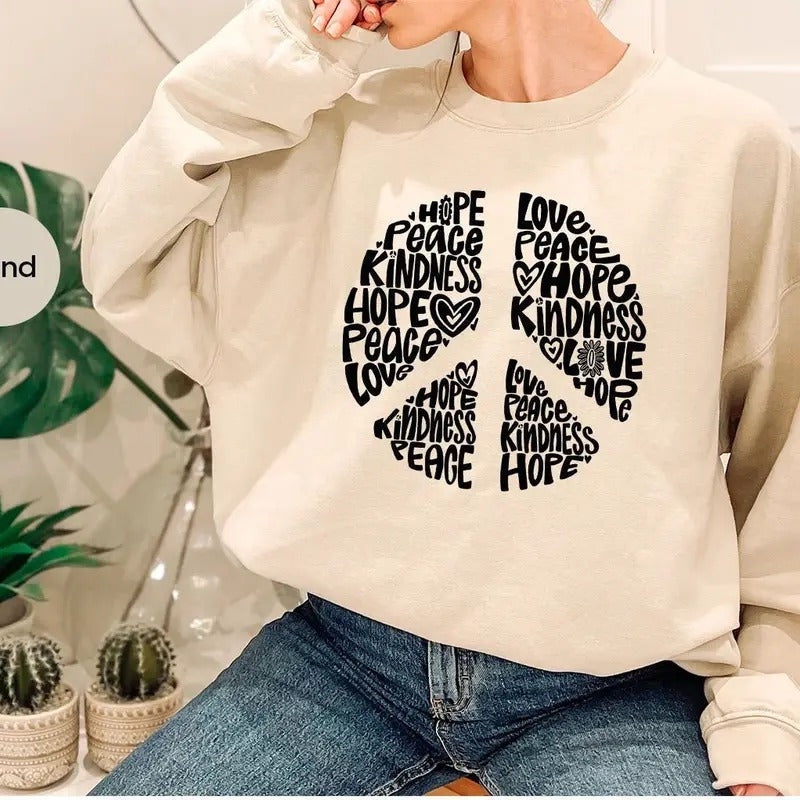 Inspirational Peace Sign Graphic Sweatshirt for Women, Cute Positive Motivational Quotes Sweatshirt, Floral Peace Love Hope Kindness Sweatshirt