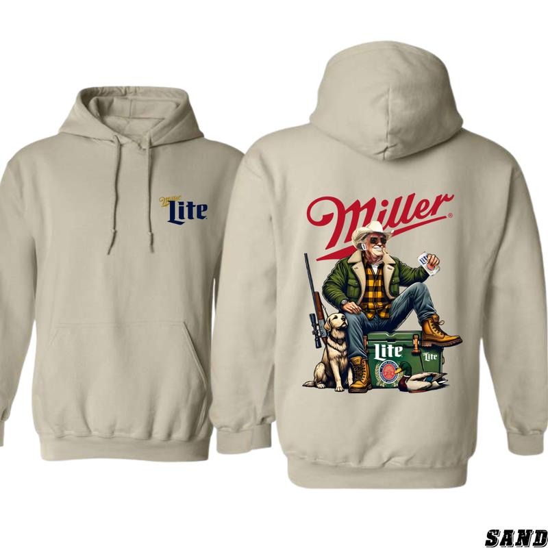 Miller Lite Hoodie - Outdoor Adventure Graphic with Man, Dog, and Cooler, Perfect for Beer and Hunting Fans, Cozy and Unique Style - Menswear, Tops