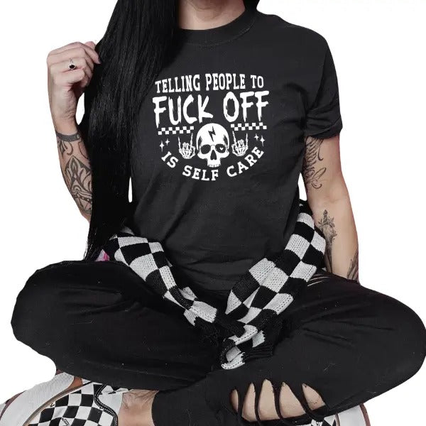 'Telling People to Fuck Off is Self Care' Long Sleeve Crewneck Sweatshirt, T Shirt, or Hoodie, Everyday Comfy Sarcastic & Offensive Shirt, Womenswear